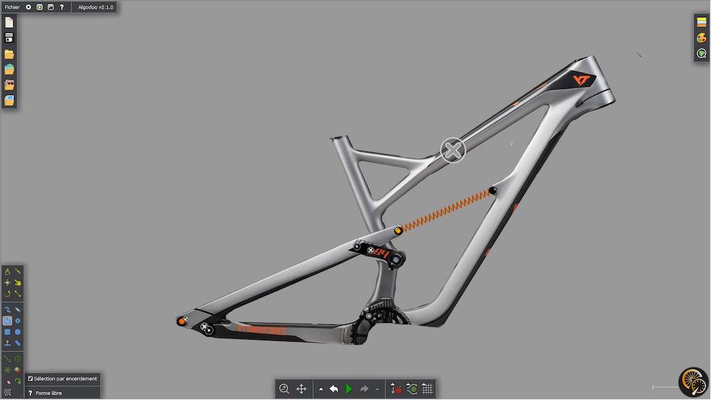 Un super tuto sur YouTube explique justement comment construire ou vérifier ses propres cinématiques de VTT. Il propose pour cela d’utiliser le logiciel Algodoo, un outil de modélisation 2D, gratuit, très bien fait et intuitif (dire que je ne me suis pas pris la tête serait faux, mais c’est tout de même raisonnable).