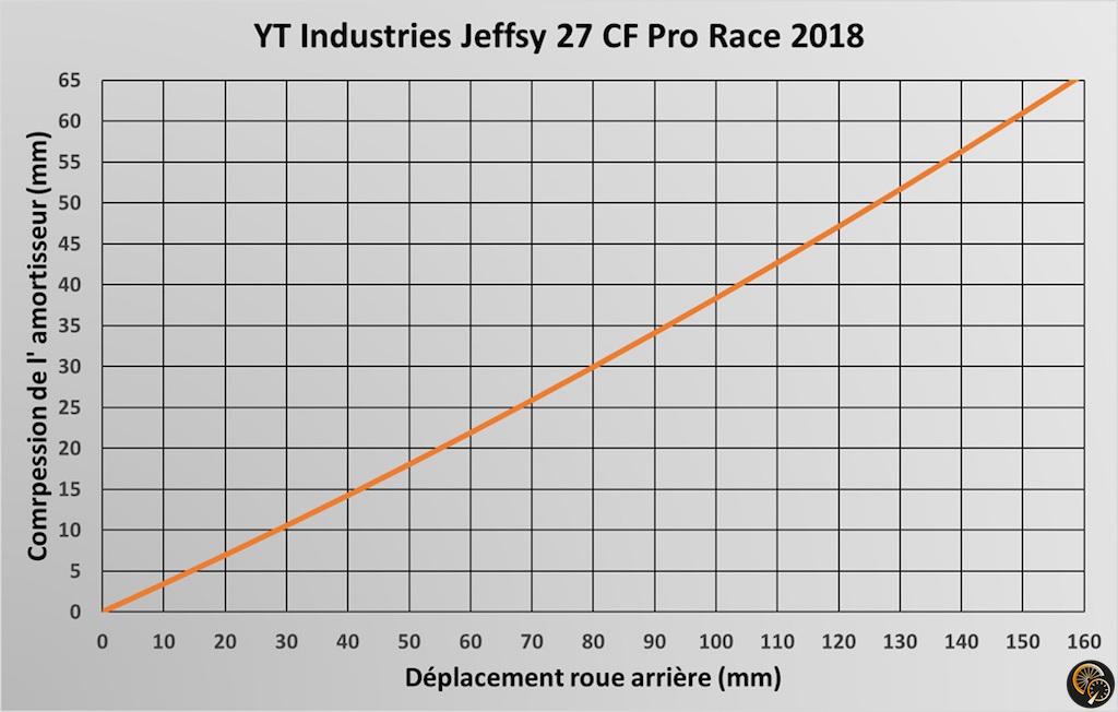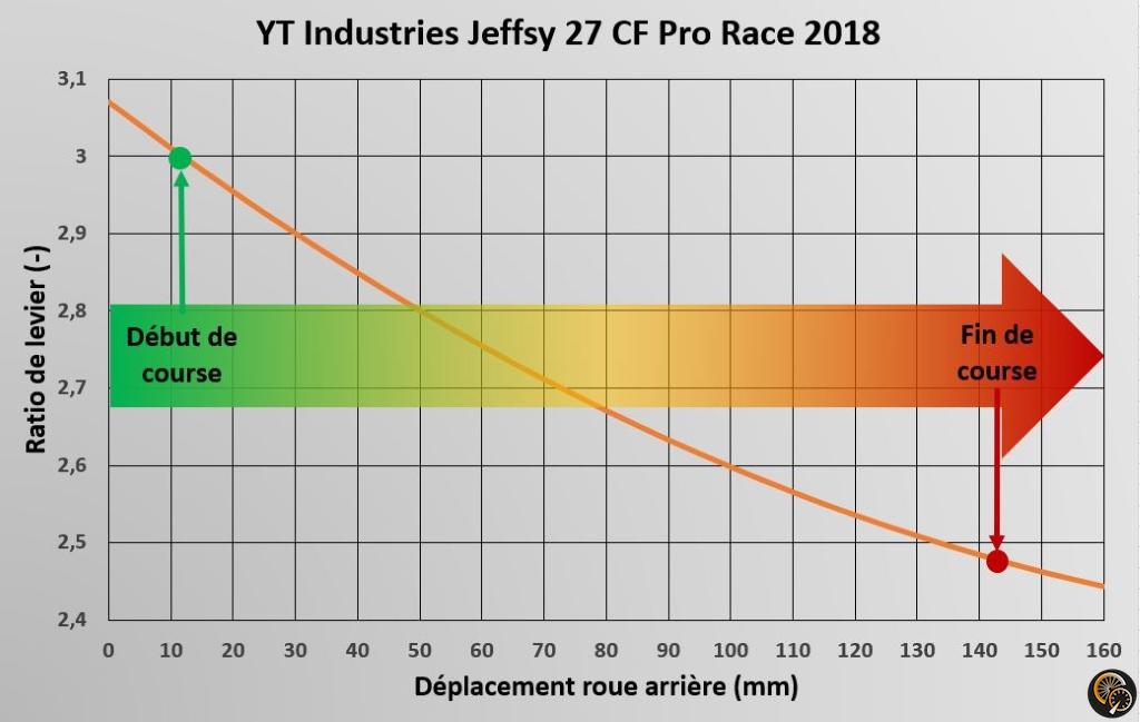 Le Jeffsy a bien une cinématique dite progressive car le ratio de levier diminue au fur et à mesure que le déplacement de la roue arrière évolue.
