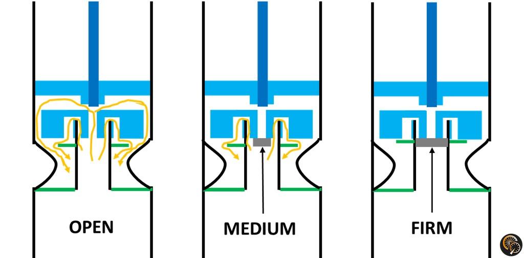 - OPEN : lors d’une compression, l’huile peut passer dans le pointeau de compression lente et à travers les clapets de compression rapide (si la vitesse de déplacement de l’axe est suffisamment importante). C’est évidemment le réglage le plus confortable car il permet de fixer un tous les défauts du terrain, ou presque. On pourra l’utiliser principalement en descente, ou sur le plat lorsque le terrain est cassant.