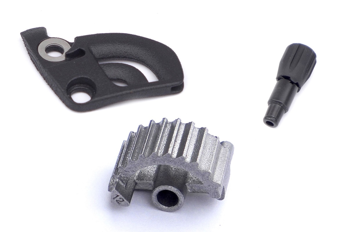 C’est un système que les adeptes du gravel connaissent sans doute. En effet, il permet de transformer une transmission SRAM mono-plateau 10 ou 11 vitesses en 12 vitesses, tout en conservant le même levier. Typiquement, pouvoir utiliser une cassette Eagle de VTT sur un gravel pour profiter de la grande amplitude de cette cassette. Et sans passer par la case AXS qui coûte très cher. Mais là n’est pas le débat. Ratio Technology a modifié la crémaillère intégrée dans le levier, de façon à lui intégrer cette 12ème vitesse. Cette petite crémaillère est imprimée en 3D en acier inoxydable. Top.